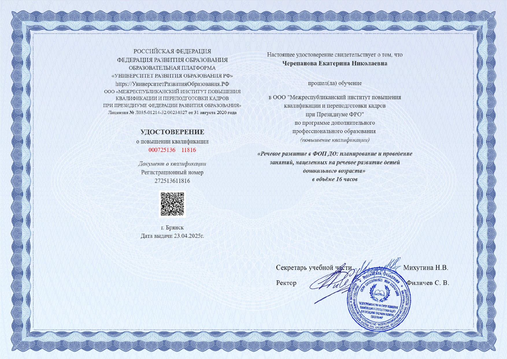 Сертификат Речевое развитие детей дошкольного возраста_технологии и направления работы воспитателя_Ноябрь 2023