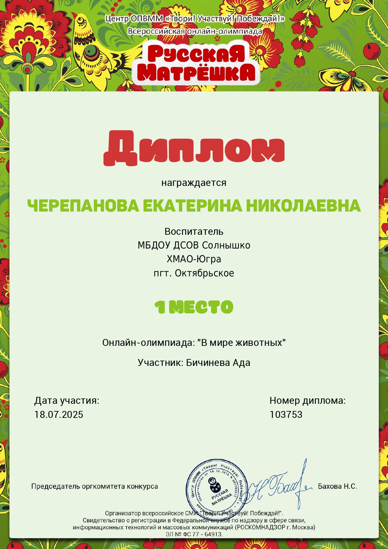 Участие с ребенком Русская матрешка, онлайн-олимпиада "В мире животных", диплом 1 место